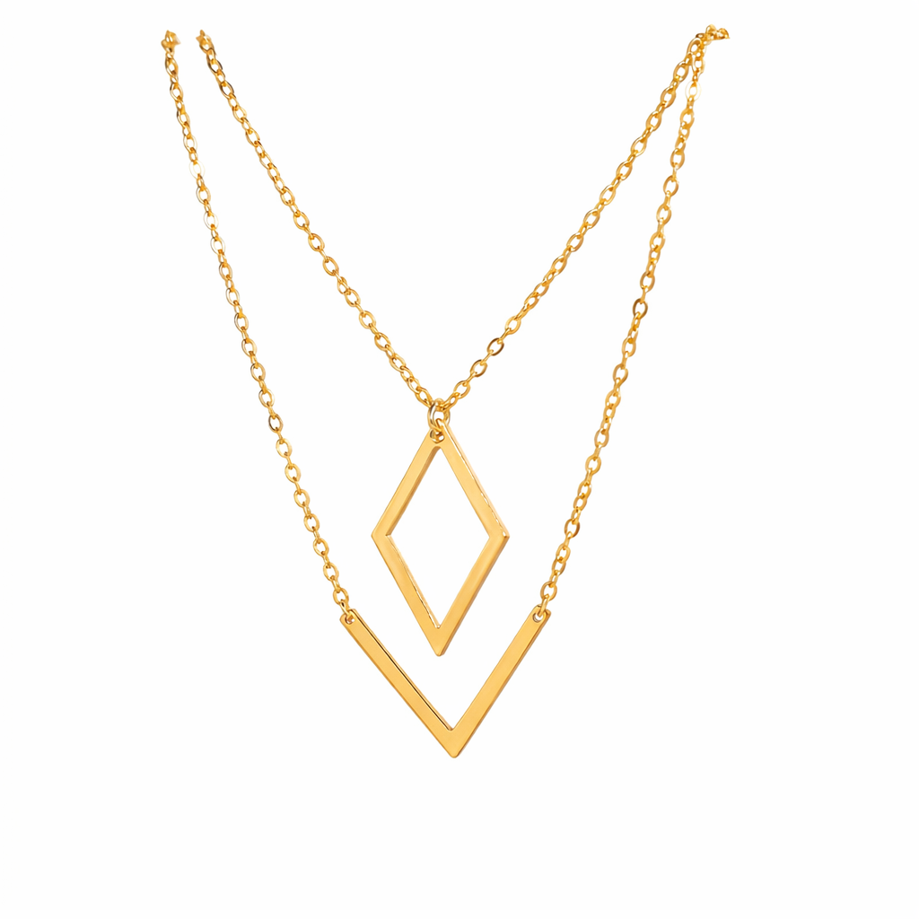Compuesto por dos cadenas finas en acabado dorado, crea un efecto de superposición equilibrado que estiliza el cuello con sutileza. Sus colgantes geométricos en forma de rombo y “V” invertida aportan un diseño estructurado.