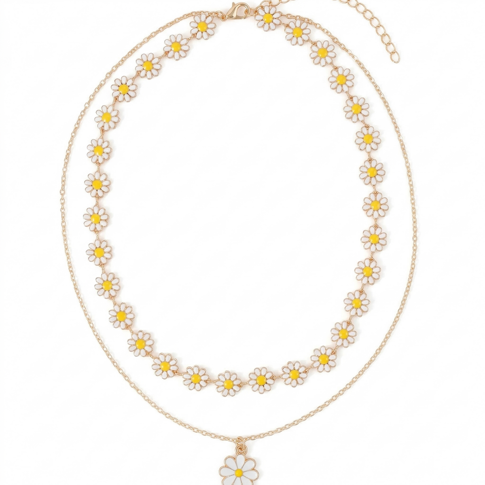 El collar inferior, más largo, incorpora una cadena fina con un colgante central de margarita.