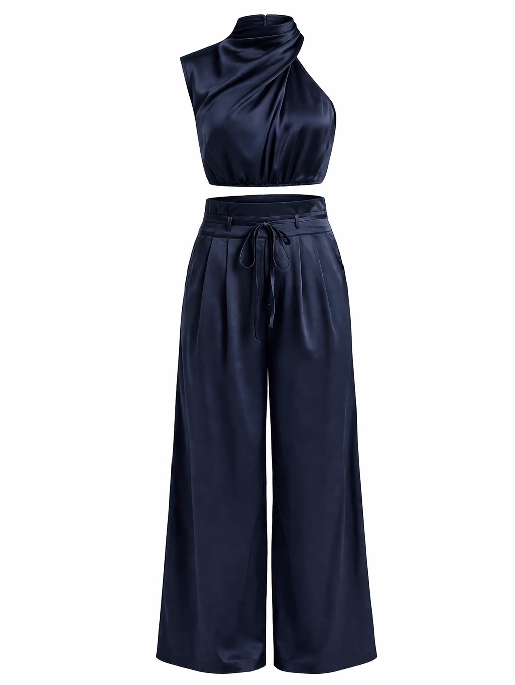 Este conjunto de dos piezas combina modernidad y elegancia en un diseño fluido que destaca por su acabado satinado y su silueta contemporánea.